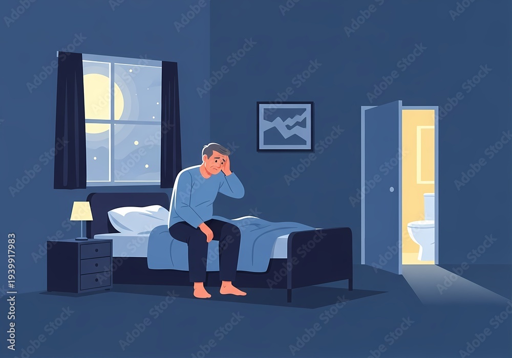 Man suffering from frequent nighttime urination sitting on bed and going to bathroom at night, concept of nocturia, sleep disturbance and urinary problem in middle aged and elderly adults #1939917983