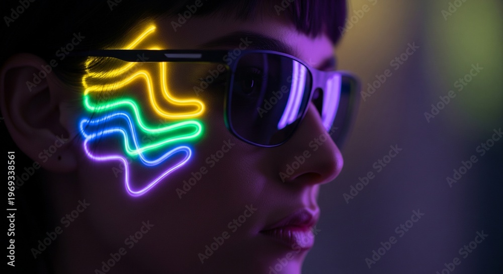Man wearing futuristic neon glasses in dark room with colorful light #1969338561
