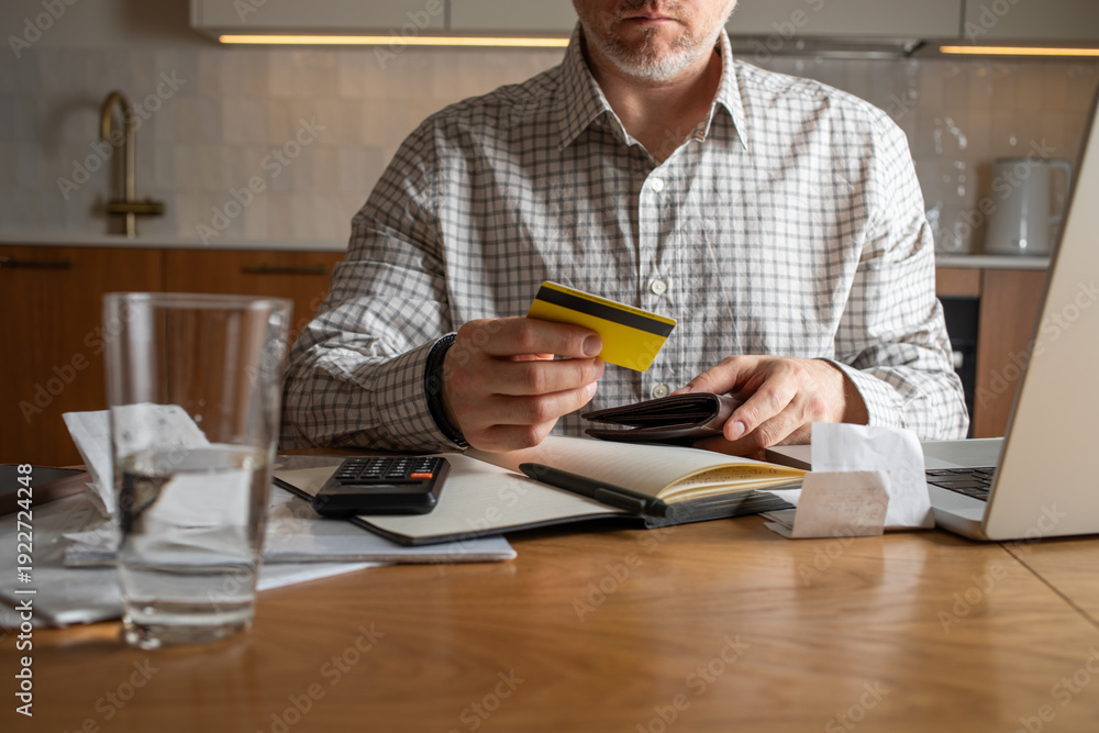 Man with credit card and wallet at his hands planning home budget at apartments kitchen with laptop and checks the balance for calculating unpaid bills for rent and expensive utility payments. #1922724248