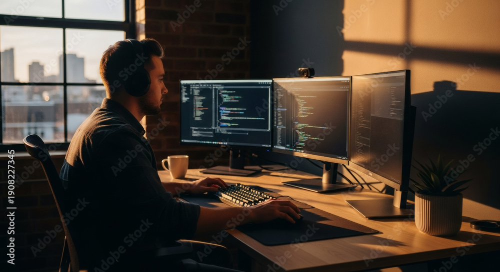 Man Working on Computer with Multiple Monitors in Modern Office Space #1908227345