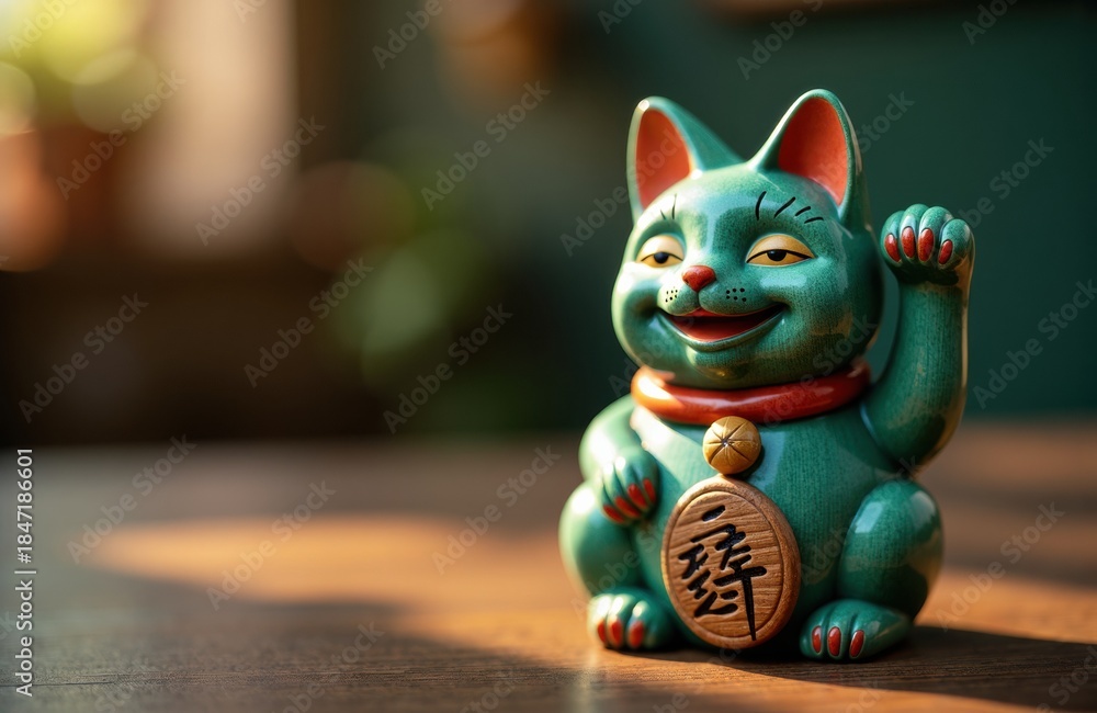 Maneki-neko cat statue bathed in warm light on a wooden surface for good luck #1847186601