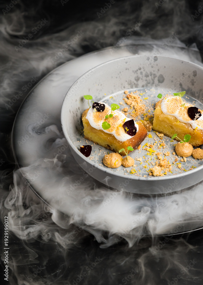 Mango and passionfruit sponge cake dessert with garnish, crumbs on a plate with dry ice giving a smoke like effect #1929199012