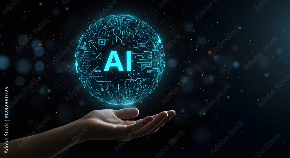 Mano sosteniendo una esfera de IA brillante que simboliza el poder y el potencial de la inteligencia artificial. #1282880725