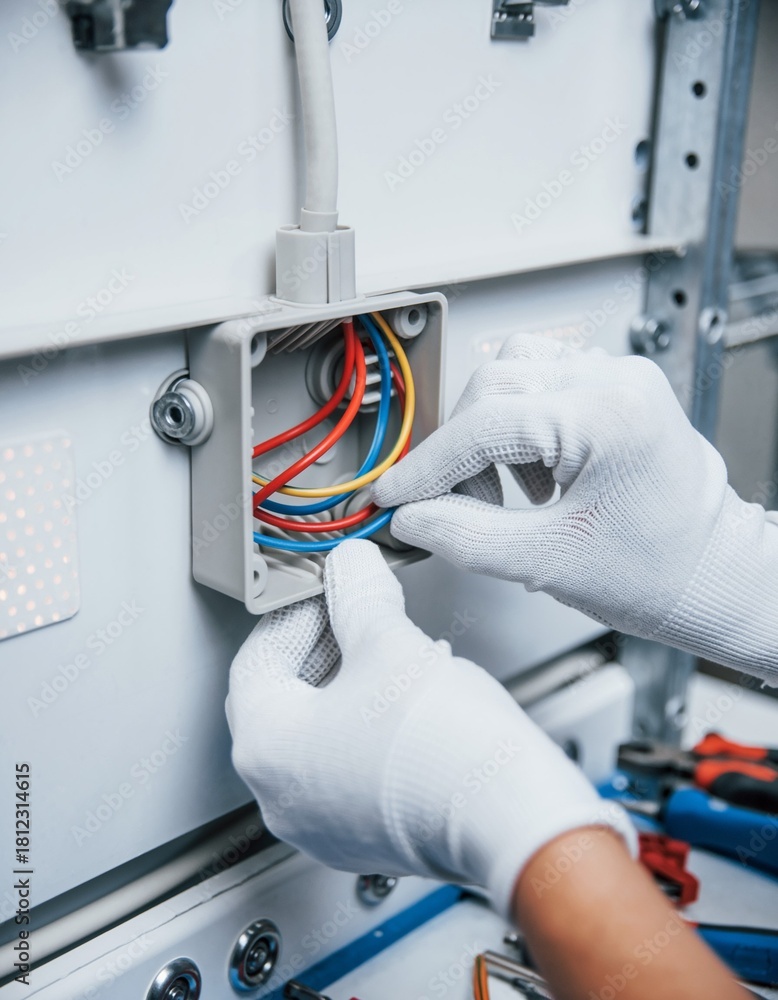 Manos de electricista profesional manipulando cables de colores en una caja de conexiones; herramientas aisladas, luz blanca, estilo fotográfico técnico y nítido #1812314615