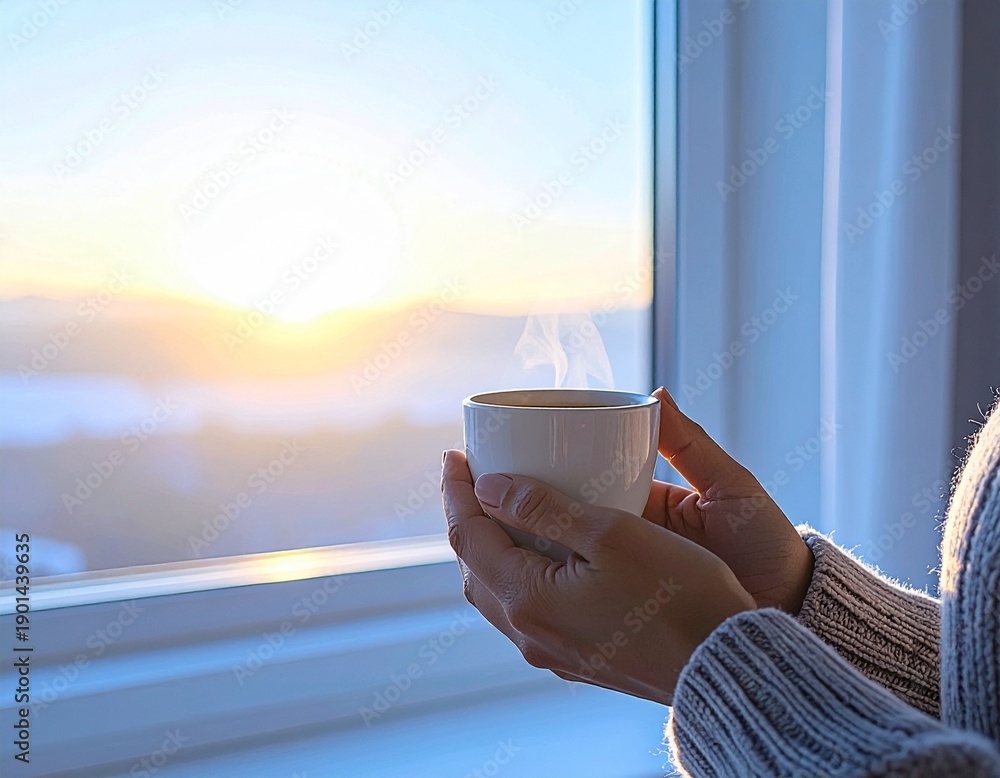Manos sosteniendo una taza caliente, atmósfera tranquila, tonos cálidos suaves #1901439635