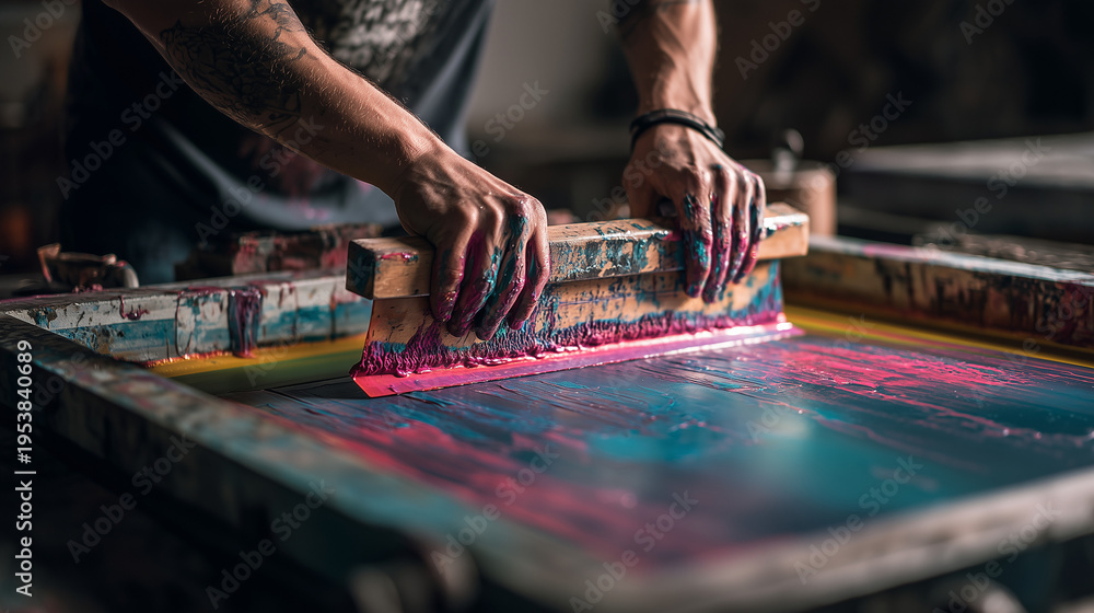 Manual screen printing process with squeegee applying ink through mesh stencil onto fabric in workshop, showing hands, tools, and detailed craftsmanship. #1953840689