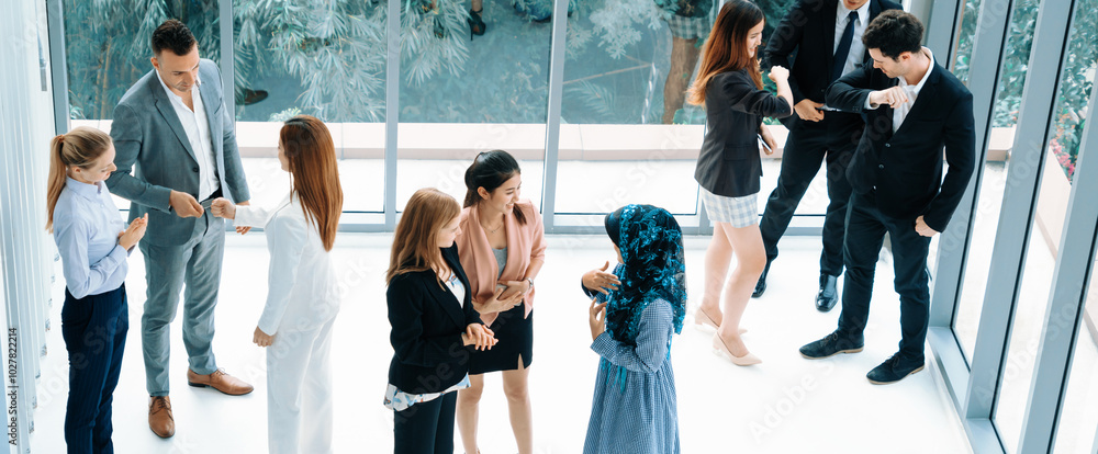 Many business people gathering in modern office building for business conference in the city. Businessmen and businesswomen communication and human resources concept. uds #1027822214