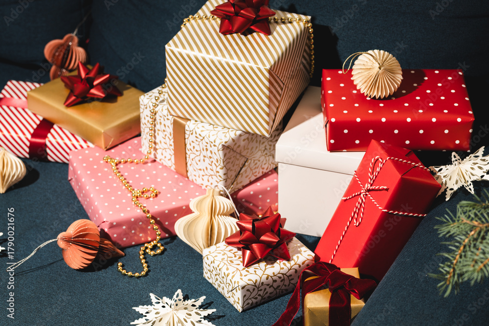 Many Christmas gifts on blue sofa #1790021676