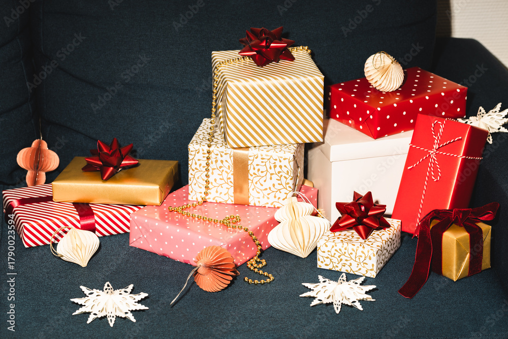 Many Christmas gifts on blue sofa #1790023594