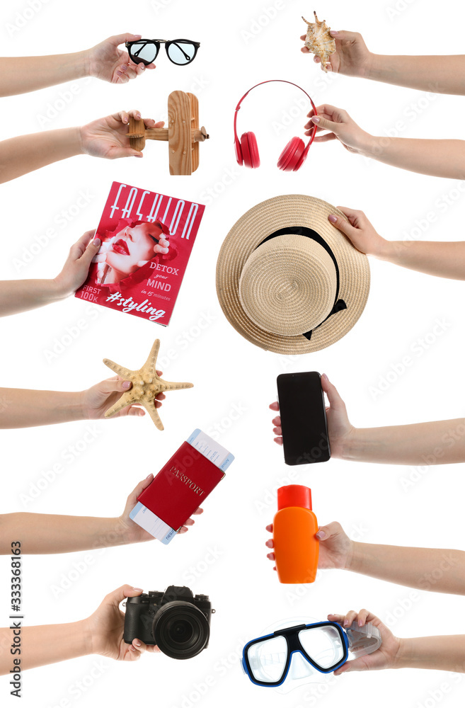 Many hands with travel items on white background #333368163