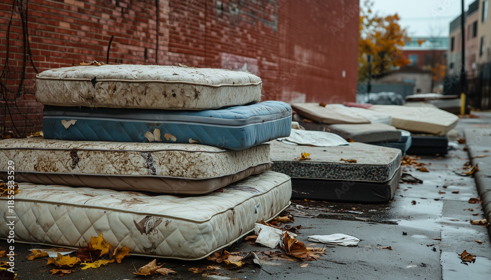 Many old dirty mattresses stacked along urban street next to brick building. Worn-out beds with visible stains form large messy pile on #1855333529