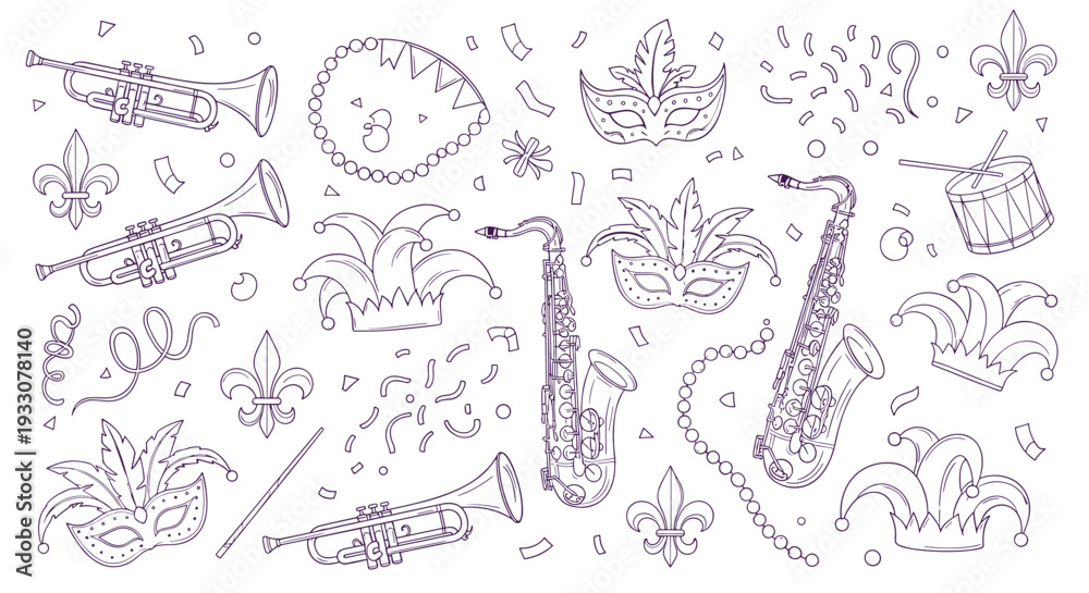 Mardi Gras Celebration Elements Collection Featuring Musical Instruments Masks and Confetti for Festive Occasions #1933078140