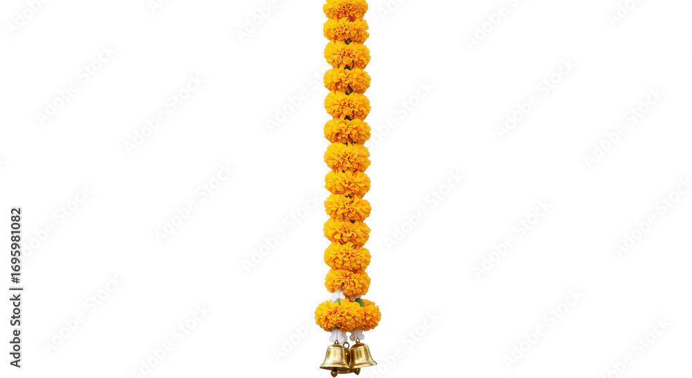 Marigold Garland: A vibrant and colorful marigold garland hangs, showcasing its golden hue and intricate floral arrangement with bells. capturing the aesthetic of traditional decorations. #1695981082