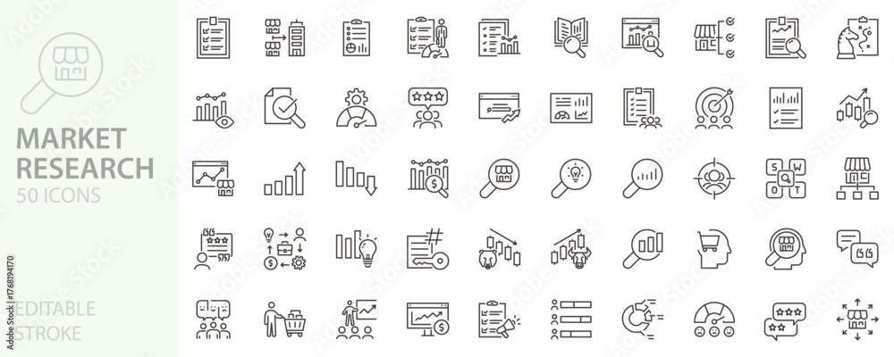 Market research icon set. Analytics, data, audience, strategy, insights, trends, growth icons. Thin line editable stroke vector illustrations #1768194170