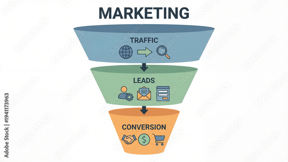 Marketing funnel diagram progressing from website traffic through lead generation to conversion stage for customer acquisition sales strategy and business revenue growth #1941173963
