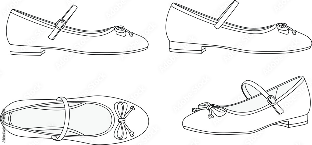 Mary Jane shoe multi-view technical line drawing illustration featuring strap buckle bow rounded toe low heel flat vector illustration #1948878066