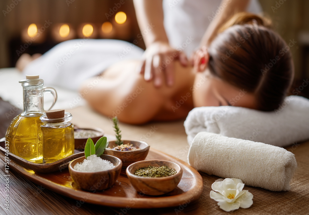 Masaje relajante de spa con aceites, toallas, flores y luz suave para un bienestar completo. Evoca armonía, purificación interior y un refugio sereno del ritmo de vida acelerado. #1757740337