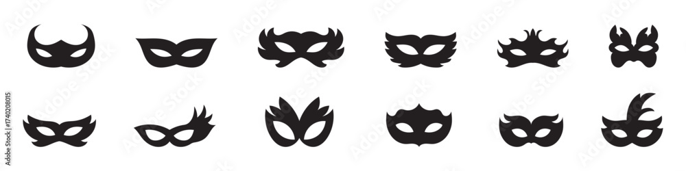 Mask superhero or carnival bandit burglar vector icon set. Black masquerade costume eye mask silhouette hidden villain scammer face. Simple design theater artist masque shape vector illustration. #1740208015