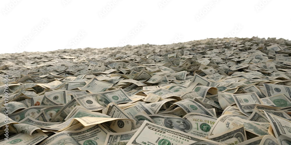 Massive pile of us dollar bills creating a large mountain of cash isolated on transparent background #1739764160