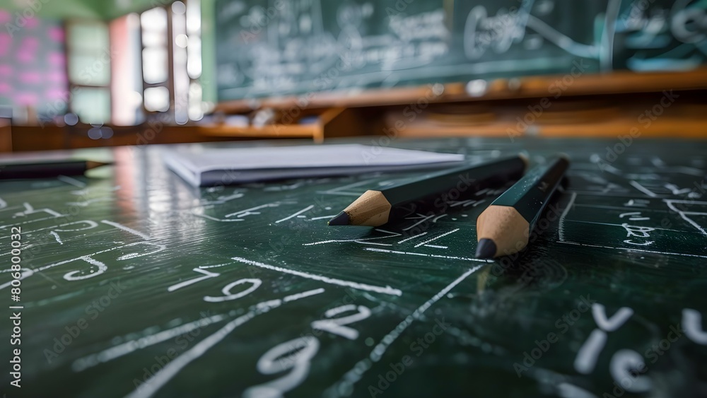 Math and science equations and geometrical figures on a school blackboard. Concept Math Equations, Science Formulas, Geometrical Figures, School Blackboard, STEM Education #806800032