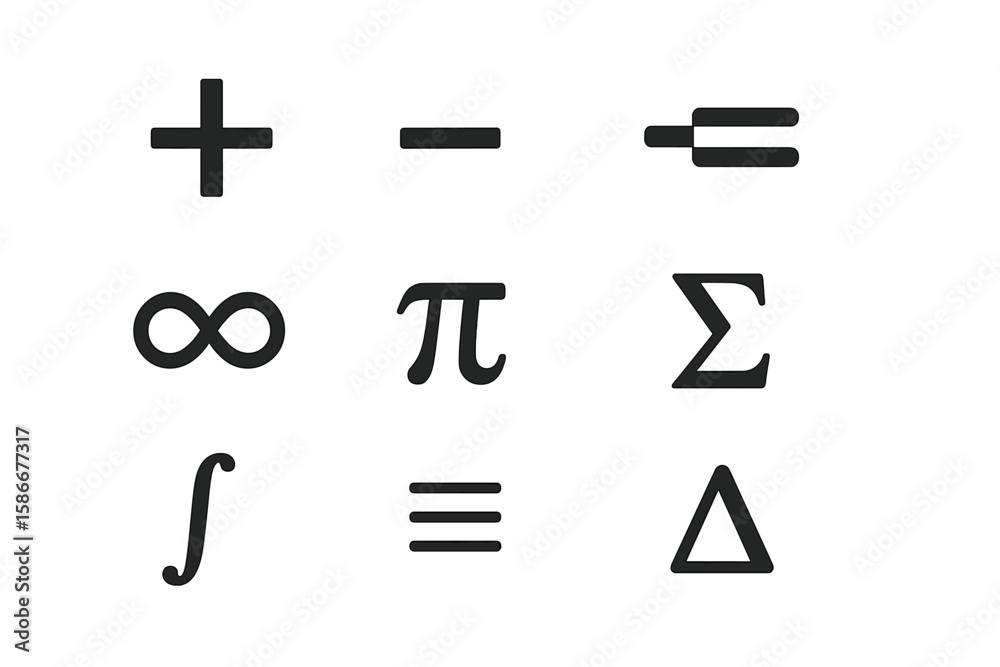 Math symbols vector icon set. Flat minimalist design of mathematical signs. Plus, minus, equal, not equal, infinity, pi, sigma, integral, delta. Algebra and calculus education. #1586677317