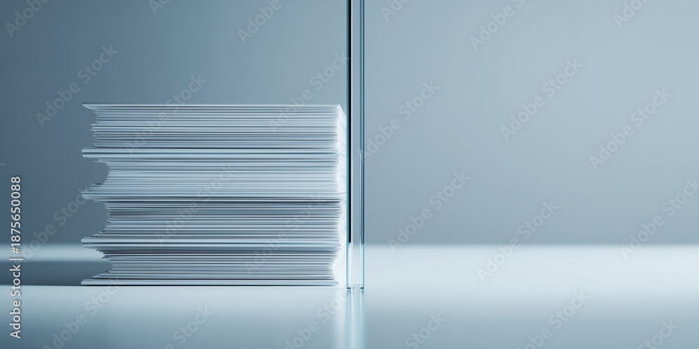 Matte white document stack pierced by a transparent glass line symbolizing legal clarity and transparency on a muted blue-gray background. #1875650088