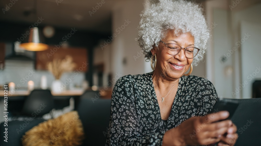 mature african woman using smartphone app for creating playlist with rock music senior female having fun with mobile phone technology tech and joyful elderly lifestyle concept focus on face no log #1671312261