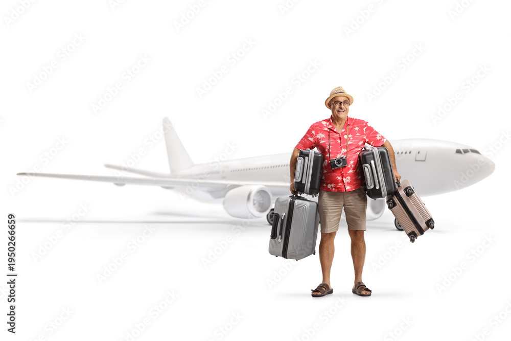 Mature male tourist carrying suitcases and standing in front of an airplane #1950266659