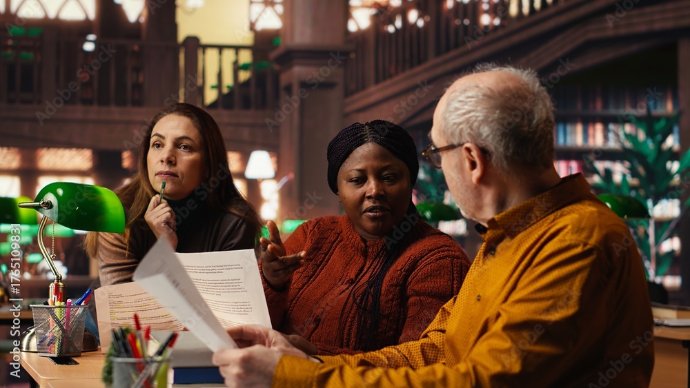 Mature team of performers rehearsing script dialogue together in a library, making drama play role preparations for character development. commitment to acting and dramaturgy. #1765109831