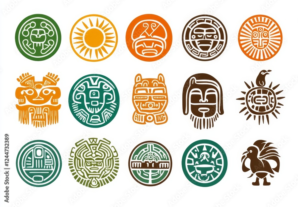 Mayan Aztec totems, current Mexican tribal symbols of sacred animals and birds. Totem signs from the Maya or Mexico Inca tribe feature the sun, fish, turtle, pyramid, deity masks, and ethnic Aztec #1244732389