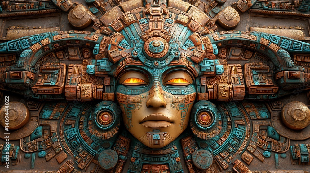 Mayan Goddess face, intricate relief, temple wall, glowing eyes #1409444022