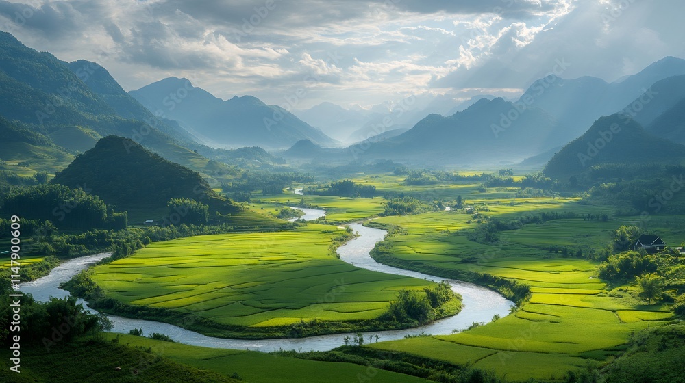 Meandering river winding through lush green rice paddies in vietnam #1147900609