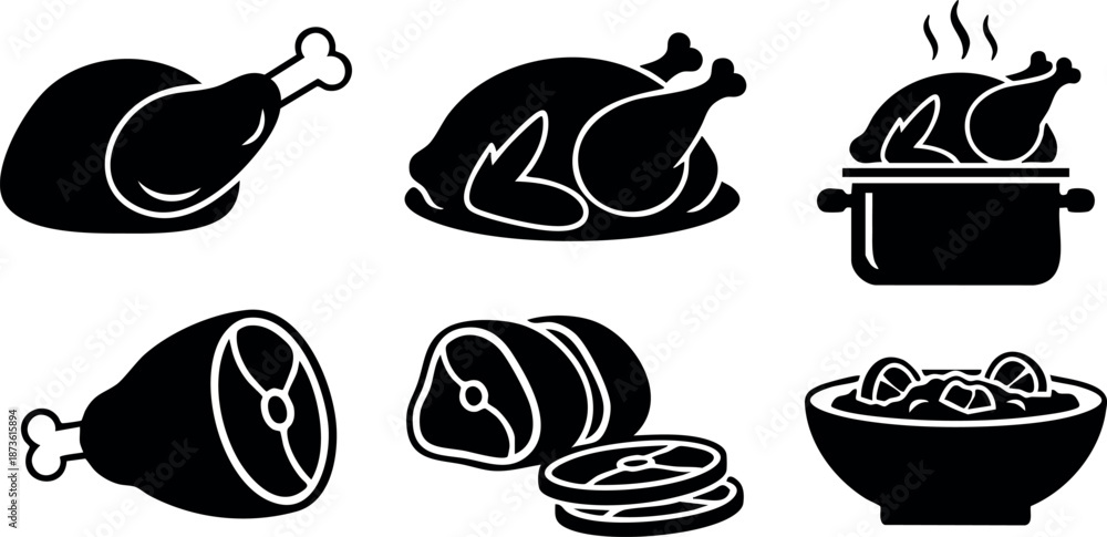 Meat and poultry icons including roasted chicken ham bowl of meat vector illustration set #1873615894