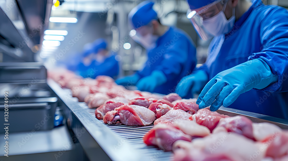 Meat Processing Plant: A detailed view of a modern meat processing plant, showcasing workers in protective gear meticulously inspecting and processing cuts of meat along a conveyor belt. #1320174992