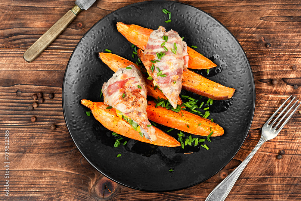 Meat roulade and roasted sweet potatoes. #779522385