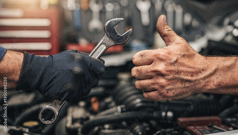 Mechanic Hand with Wrench and Thumbs Up: Auto Repair Service Complete #1950198250