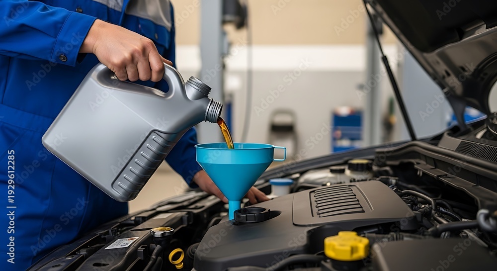 Mechanic pouring oil from a container into a car engine during a service check #1929612285