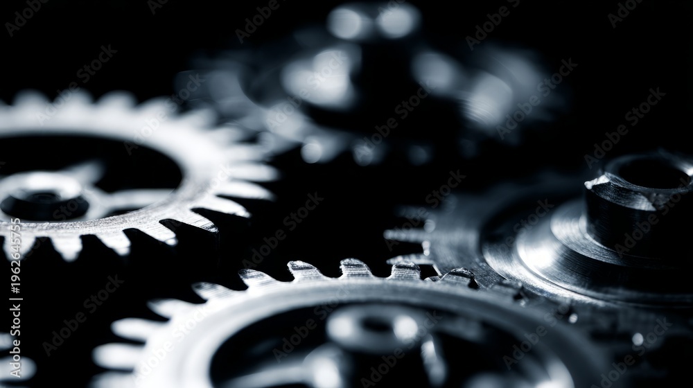 mechanism. Close-up of mechanical gears in motion with metallic textures against a dark industrial backdrop. safety posters. #1962645755