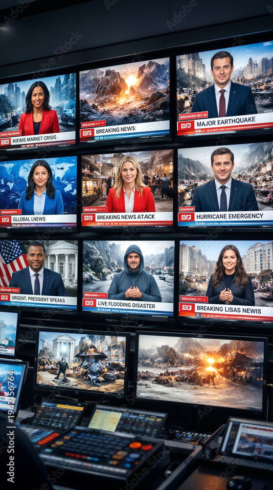 Media control room monitors displaying multiple breaking news broadcasts. Television production gallery with news anchors reporting on global events and disasters. #1942156764