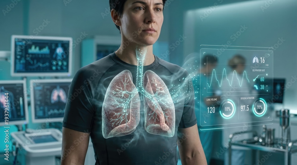 Medical illustration of lungs in a high-tech hospital environment with virtual monitoring futuristic healthcare setting #1937961444