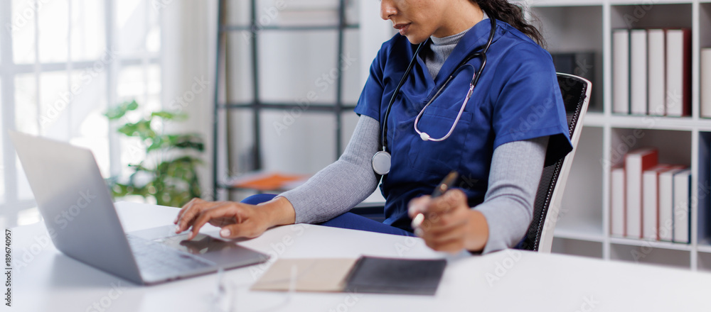 Medical professional African american in blue scrubs working on laptop, smiling while standing in well-lit healthcare environment #1896740957