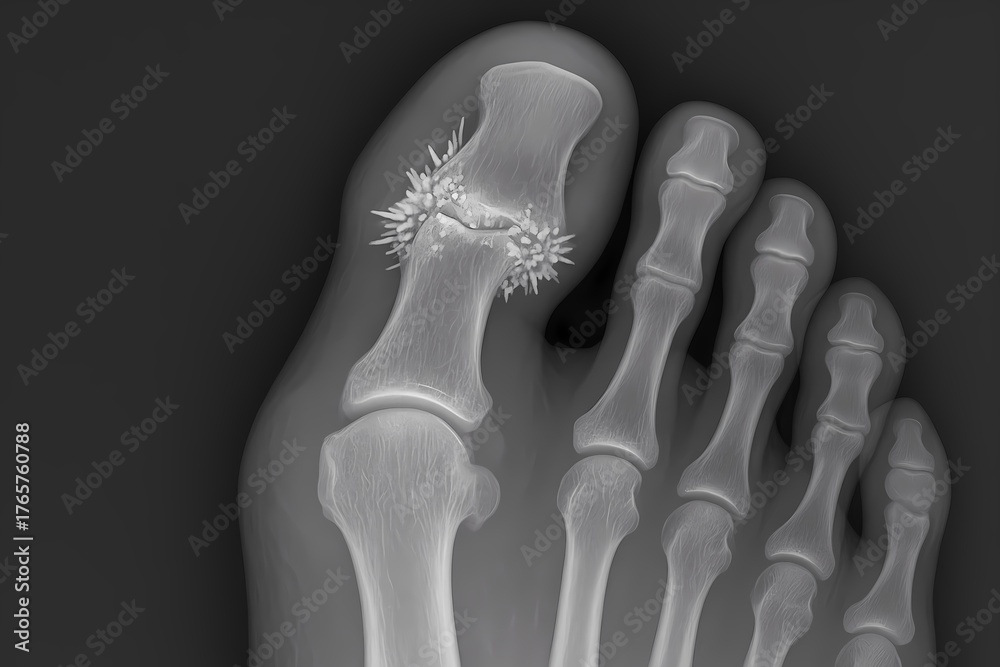 Medical X-ray image showing a gout-affected big toe joint with visible uric acid crystal deposits, illustrating inflammation, joint pain, and bone damage caused by high uric acid levels. #1765760788
