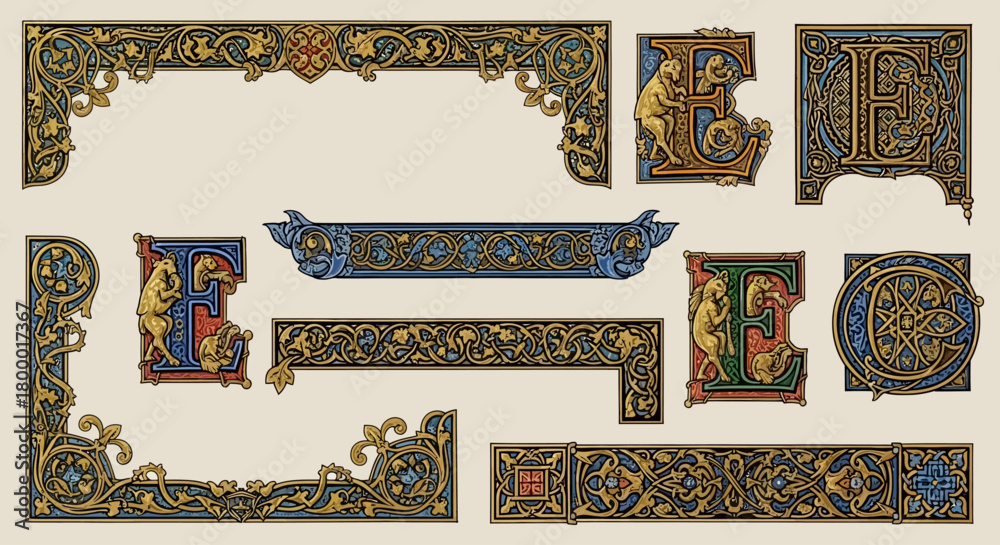 Medieval Illuminated Manuscript Vector Border Collection - Gothic Botanical and Gold Leaf Elements #1800017367