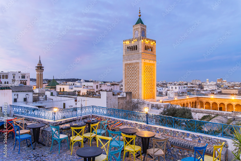 Medina, Tunis, Tunisia. Rooftop cafe overlooking the Great Mosque in the Medina of Tunis. #1182664123