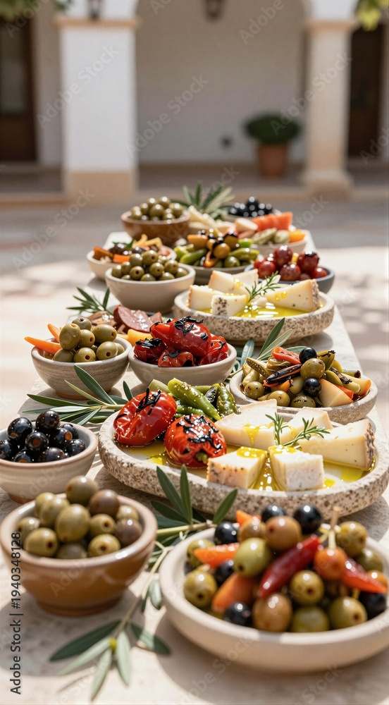 Mediterranean antipasti spread with olives, roasted peppers and cheese for grazing table platter background and event catering display #1940348128