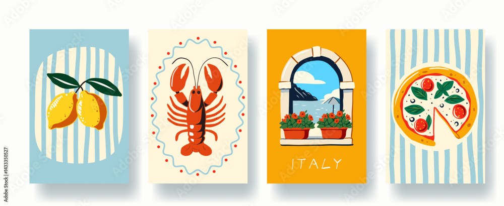 Mediterranean summer vector prints with lemons, lobster, sea window view, and pizza. Bold colors, striped backgrounds, and cheerful coastal food and travel-themed illustrations #1433350527