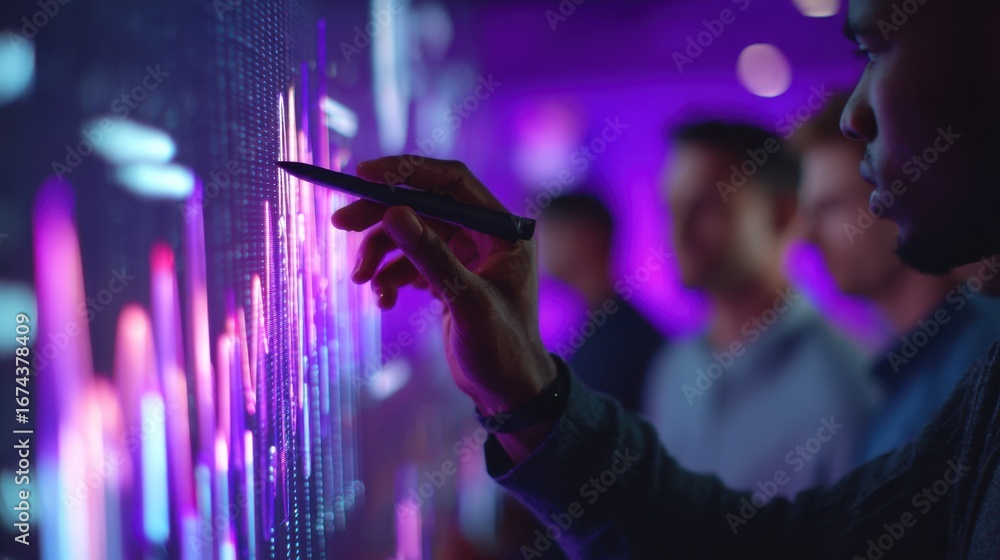 Medium shot highlighting a data analysts pointer on cyber tactic charts on a purple backlit collaboration wall with team members blurred around. #1674378409