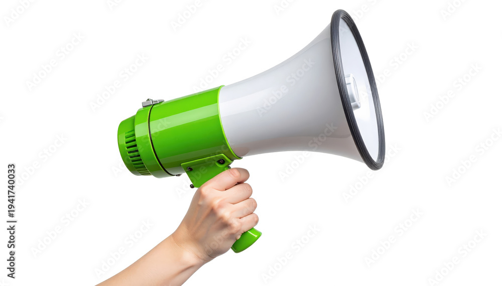 Megáfono verde en mano para anuncios, protestas, comunicaciones y campañas promocionales. #1941740033