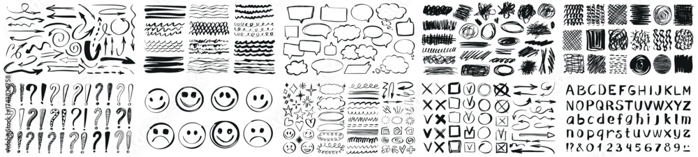 Mega set marker scribbles. Handwriting arrows, alphabet, check marks, emoji, speech bubbles, underline set of marker brush stroke texture. Bundle of different doodles. Collection vector illustrations. #1742826758