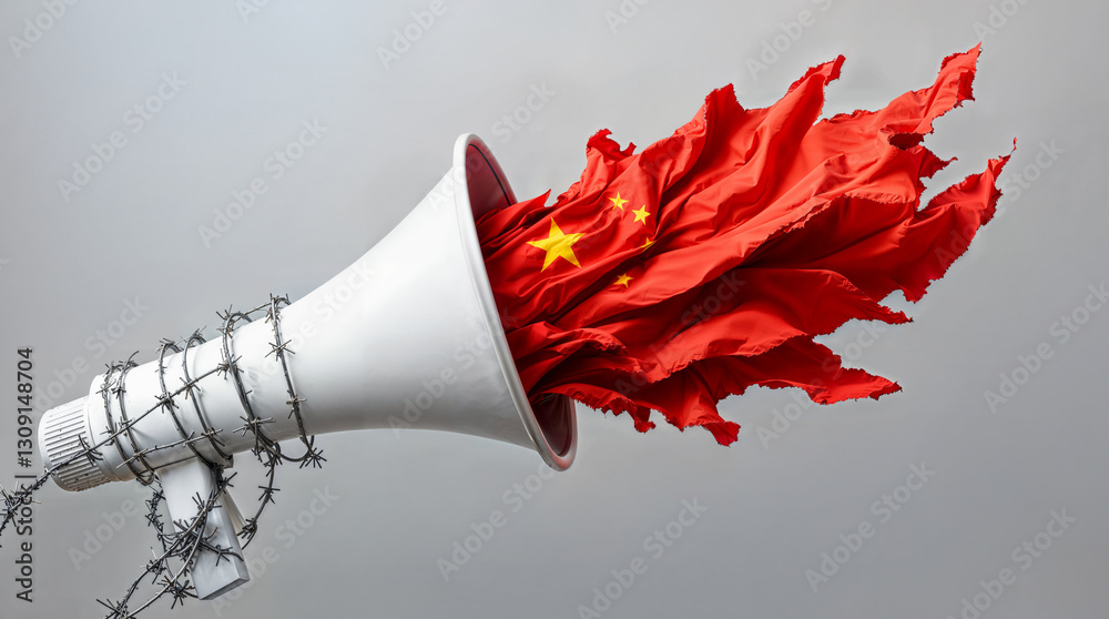 Megafon mit chinesischer Flagge und Stacheldraht – Symbol für Zensur #1309148704